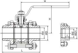 產(chǎn)品結(jié)構(gòu) 主要零件材料 材料名稱(chēng) Q11F-(16-64)C Q11F-(16-64)P Q11F-(16-64)R 閥體 WCB ZG1Cr18Ni9Ti CF8 ZG1Cr18Ni12Mo2Ti CF8M 球體 ICr18Ni9Ti 304 ICr18Ni9Ti 304 1Cr18Ni12Mo2Ti 316 閥桿 ICr18Ni9Ti 304 ICr18Ni9Ti 304 1Cr18Ni12Mo2Ti 316 密封圈 聚四氟乙烯(PTFE) 填料 聚四氟乙烯(PTFE) 主要外形尺寸 DN INCH L D G W H H1 8 1/4″ 40 5 1/4″ 70 33.5 26.5 10 3/8″ 45 7 3/8″ 70 35 26.5 15 1/2″ 55...